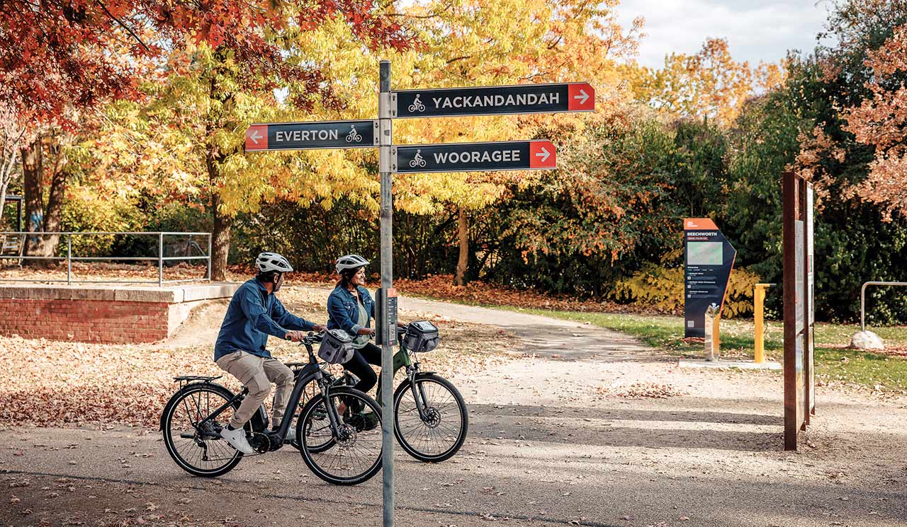 The first thing you notice on the Murray to Mountains Rail Trail is the silence. Not eerie. Just the relaxing hush that comes from swapping car engines for bike chains and deadlines for downhills. The second thing you notice is that you’re pedalling through a region that feels like it’s been curated by someone with a fondness for autumn leaves, good wine and the gentle pleasure of arriving somewhere slightly hungry.