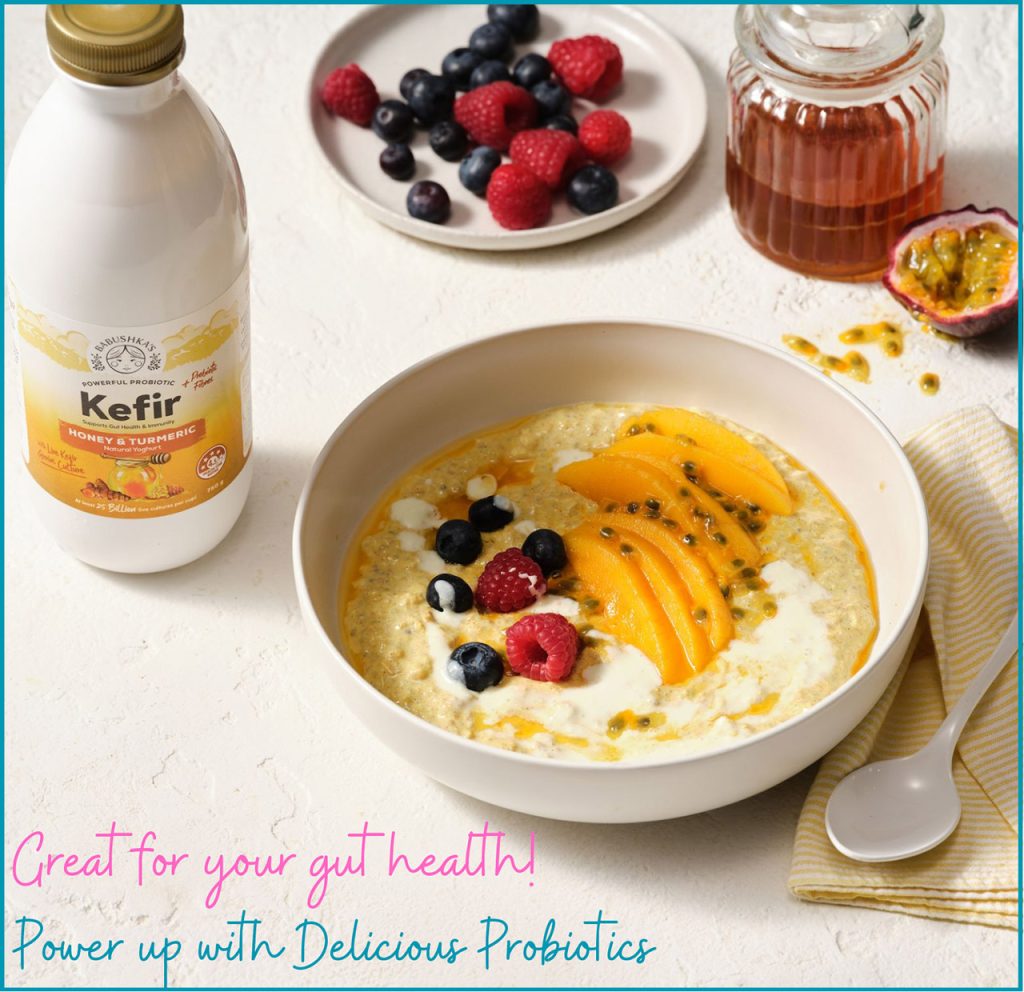 Add a healthy, delicious probiotic boost to your oats in the morning with Babushka’s Honey & Turmeric Kefir.